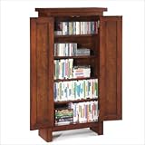 Transitional style features clean, simple lines and comfortable, functional design. Features: Rich multi step Cherry finish Poplar hardwood construction with Cherry veneers and engineered woods Two doors with raised wood detail and Brushed Nickel hardware Five shelves inside, four are adjustable to provide plenty of space for all your media storage Holds approximately 175 DVDs or approximately 290 CDs Easy to assemble Specifications: Dimensions: 50.25" H x 26" W x 11" D Weight: 70 lbs